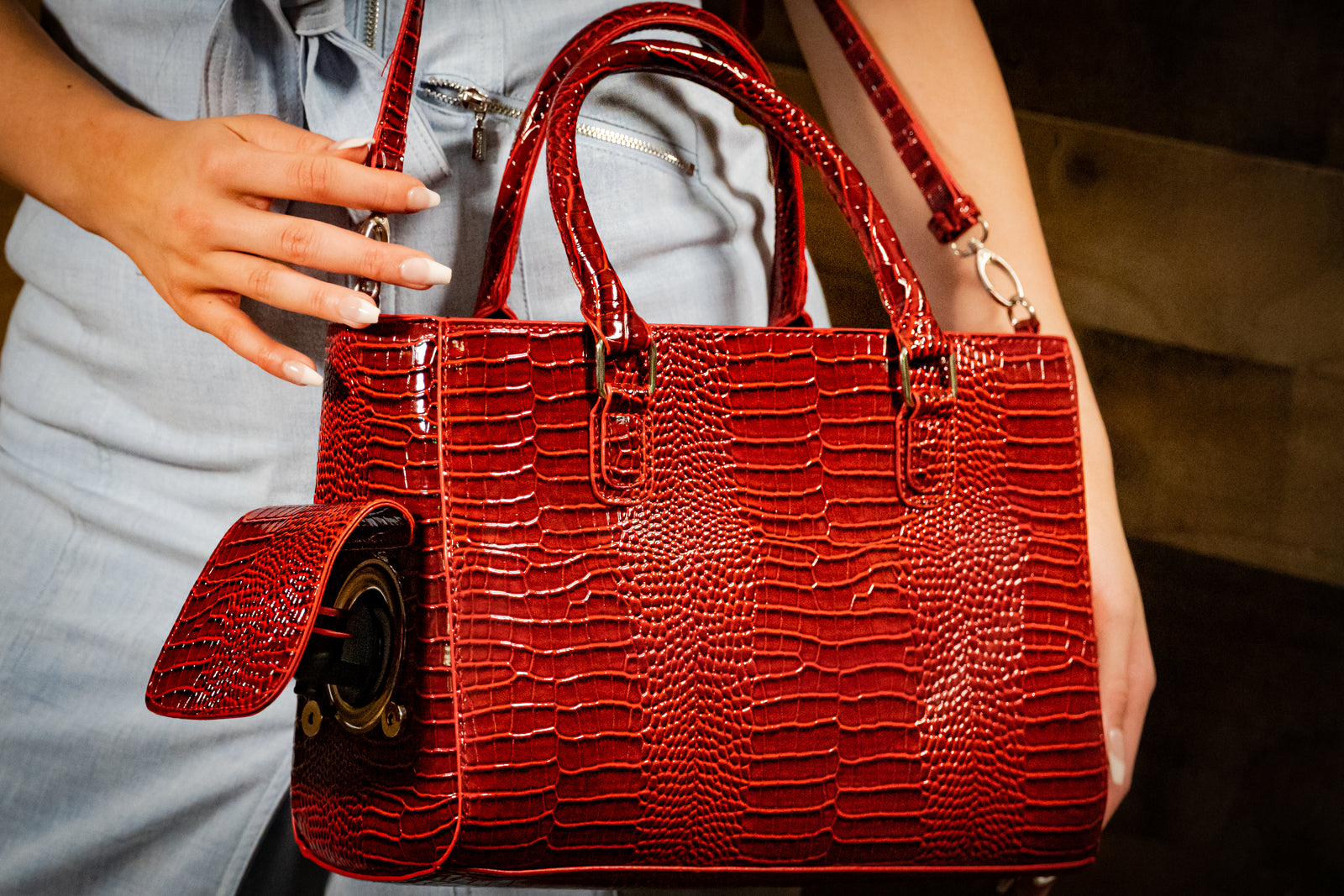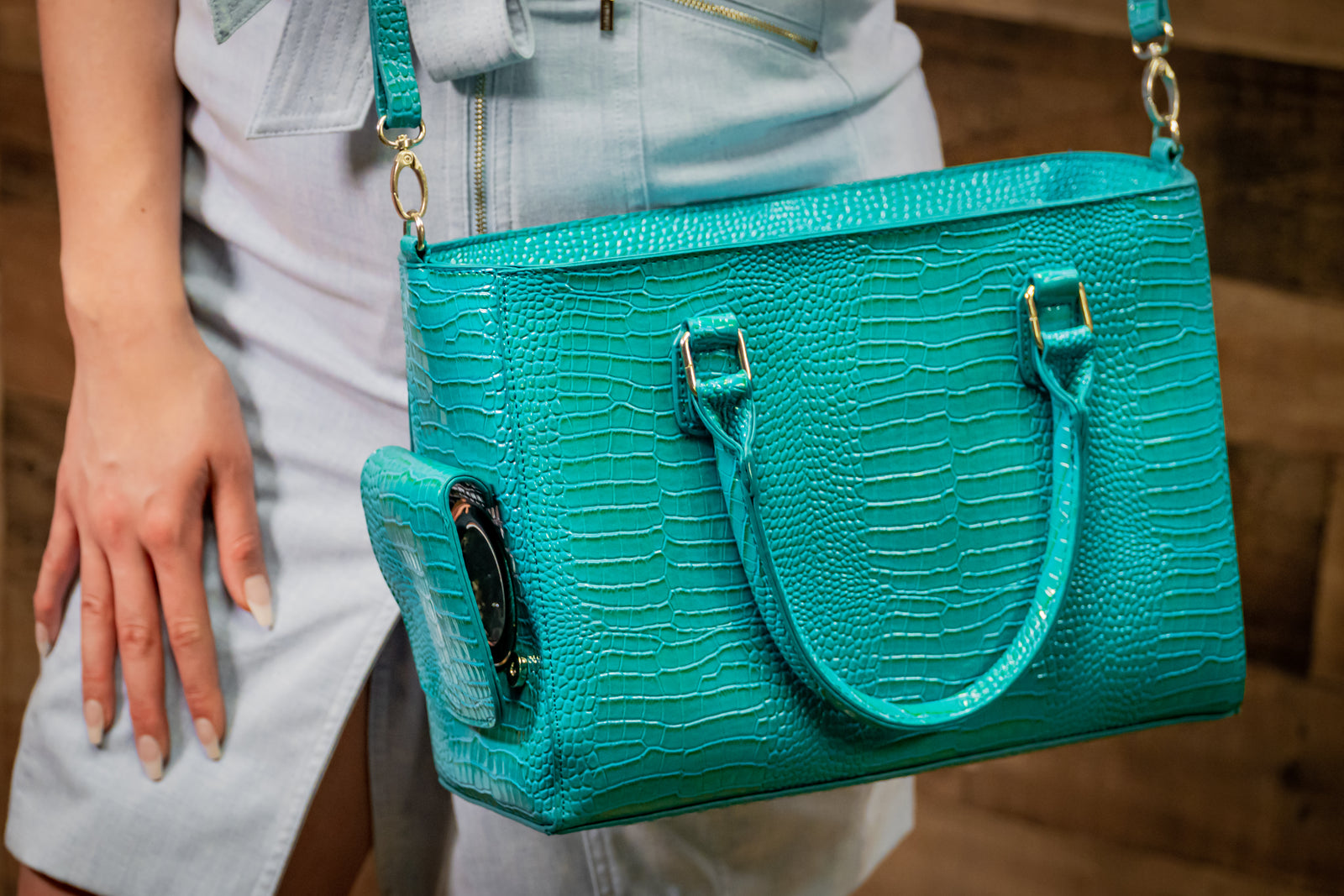 Spill-Resistant Drink Spout: Fashionable and functional, this purse with drink dispenser has an easy-pour side spout that lets you pour drinks without spills.